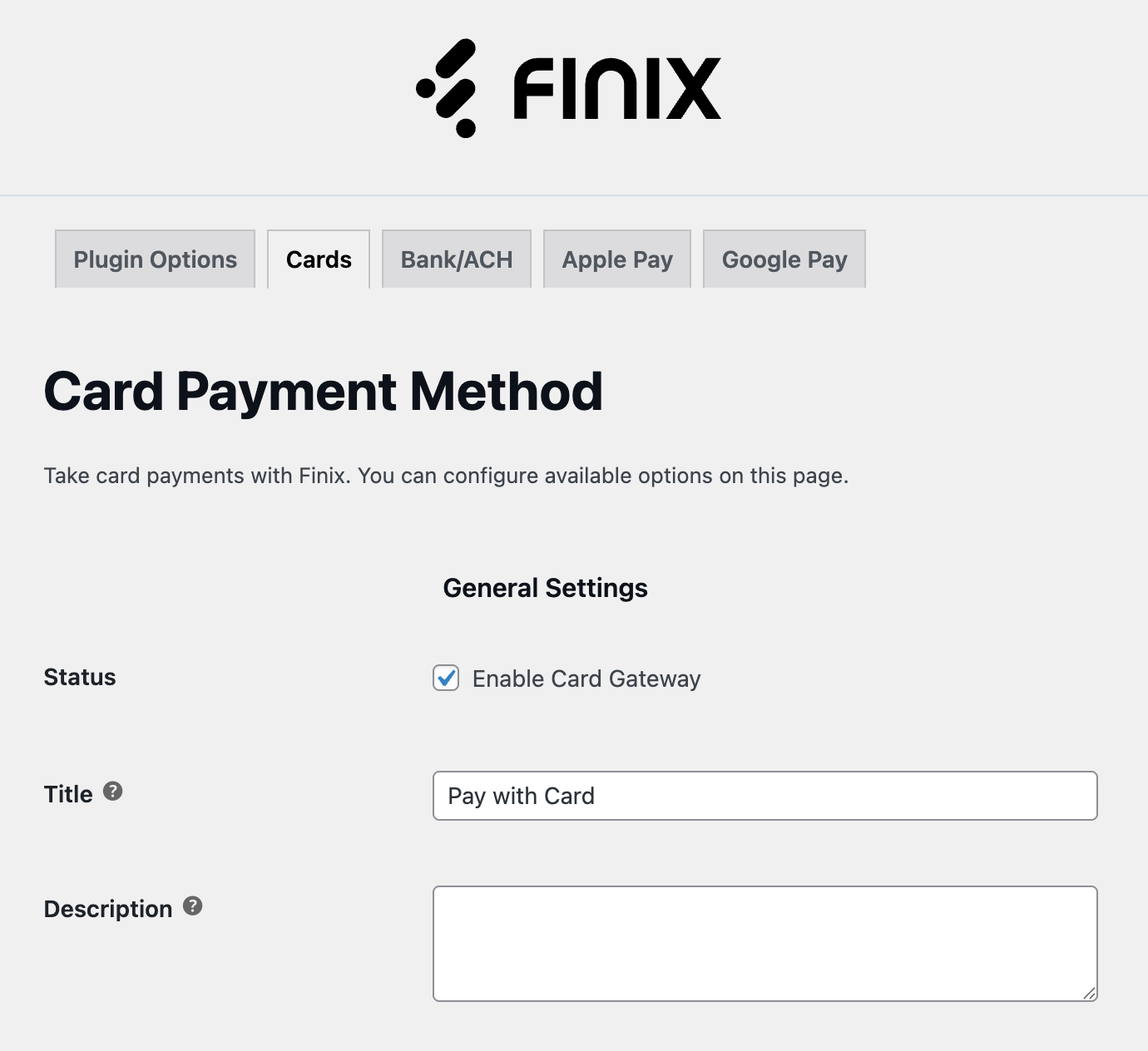 - Set your Finix API credentials key at WooCommerce -> Settings -> Payments -> Finix Gateway -> Plugin Options (or use the Settings link in the Plugins overview).